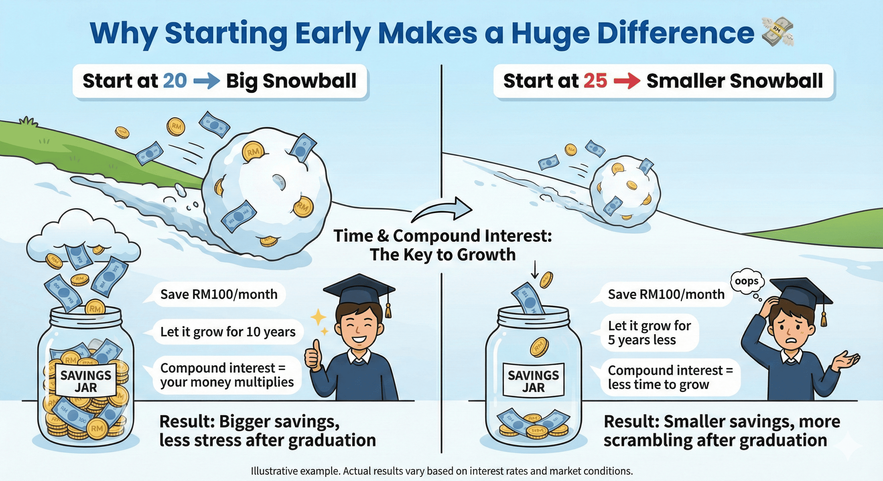Imagine this: you start saving RM100 a month at 20 vs starting at 25. By the time you’re 30, your early-start savings could be 30–50% more — all from a few extra years of compounding.