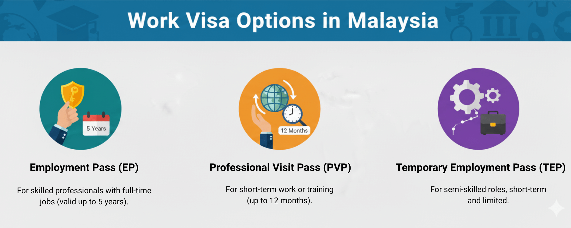 1. Employment Pass (EP): For skilled professionals who secure full‑time employment in Malaysia. It allows you to stay and work long‑term (up to 5 years).