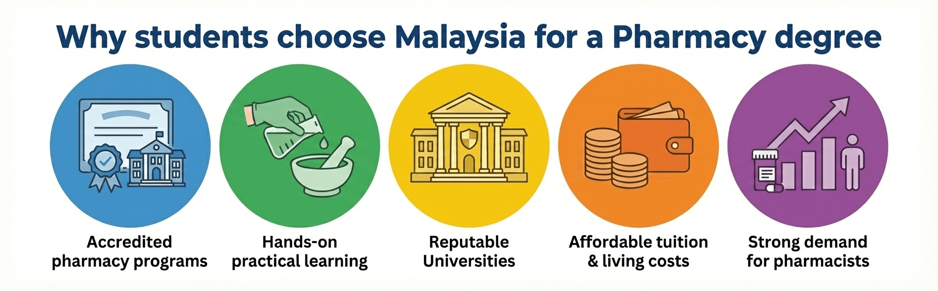 Compared to countries like the UK, Australia, or the US, Pharmacy course fees in Malaysia are more affordable, with lower overall living expenses.