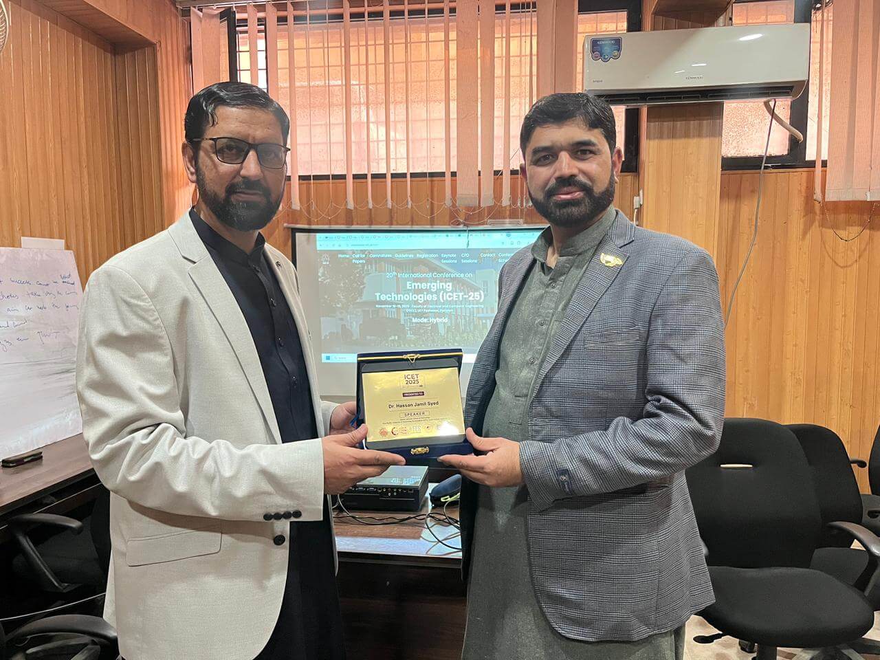 Reflecting on the invitation, Dr Hassan shared, “I was invited by Professor Dr Nasru Minallah, Chair of ICET 2025 and Director of the National Centre for Big Data & Cloud Computing at UET Peshawar, in recognition of my research contributions in AI-driven security for cloud-native environments, which strongly aligned with the conference’s focus on emerging technologies.”