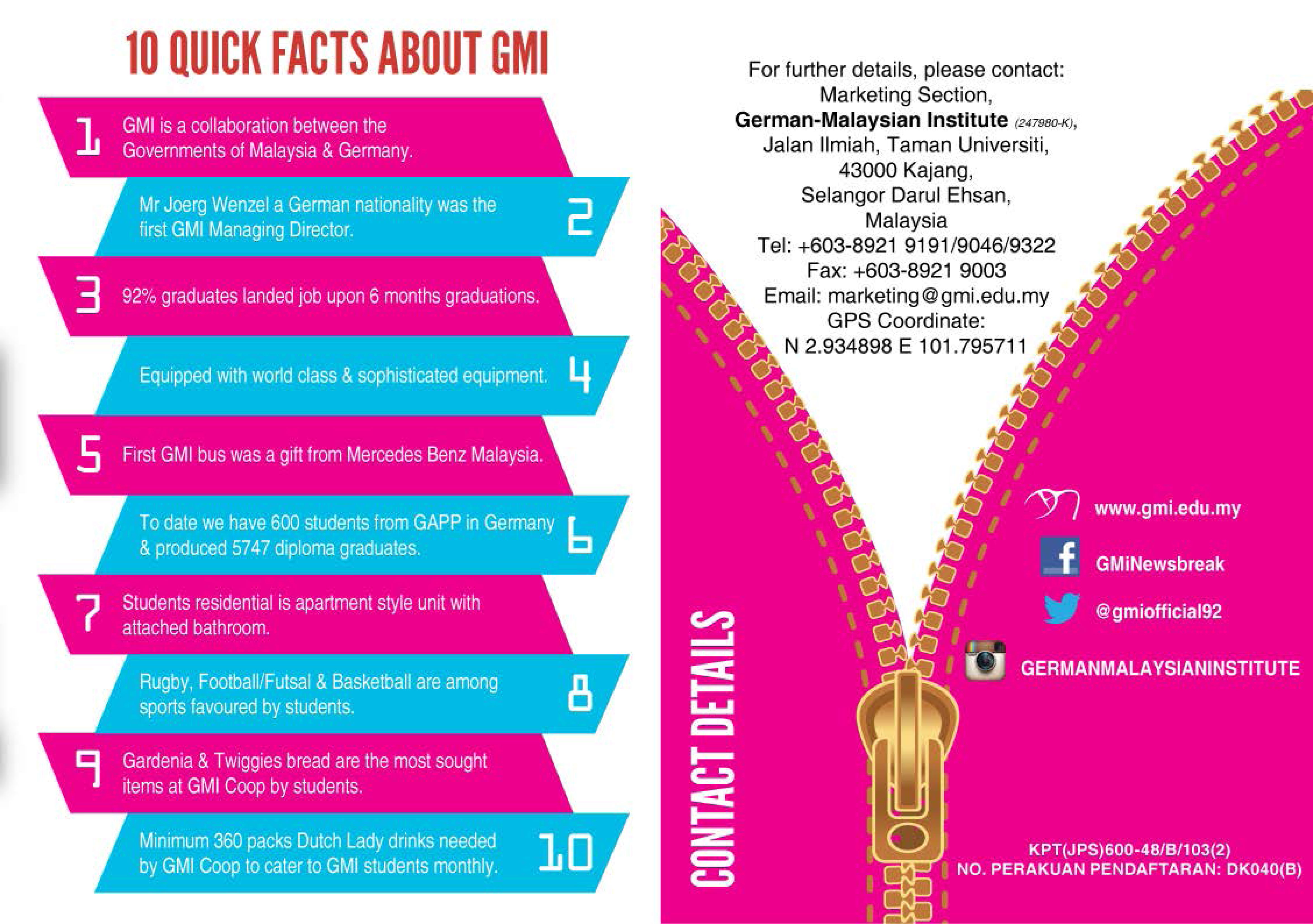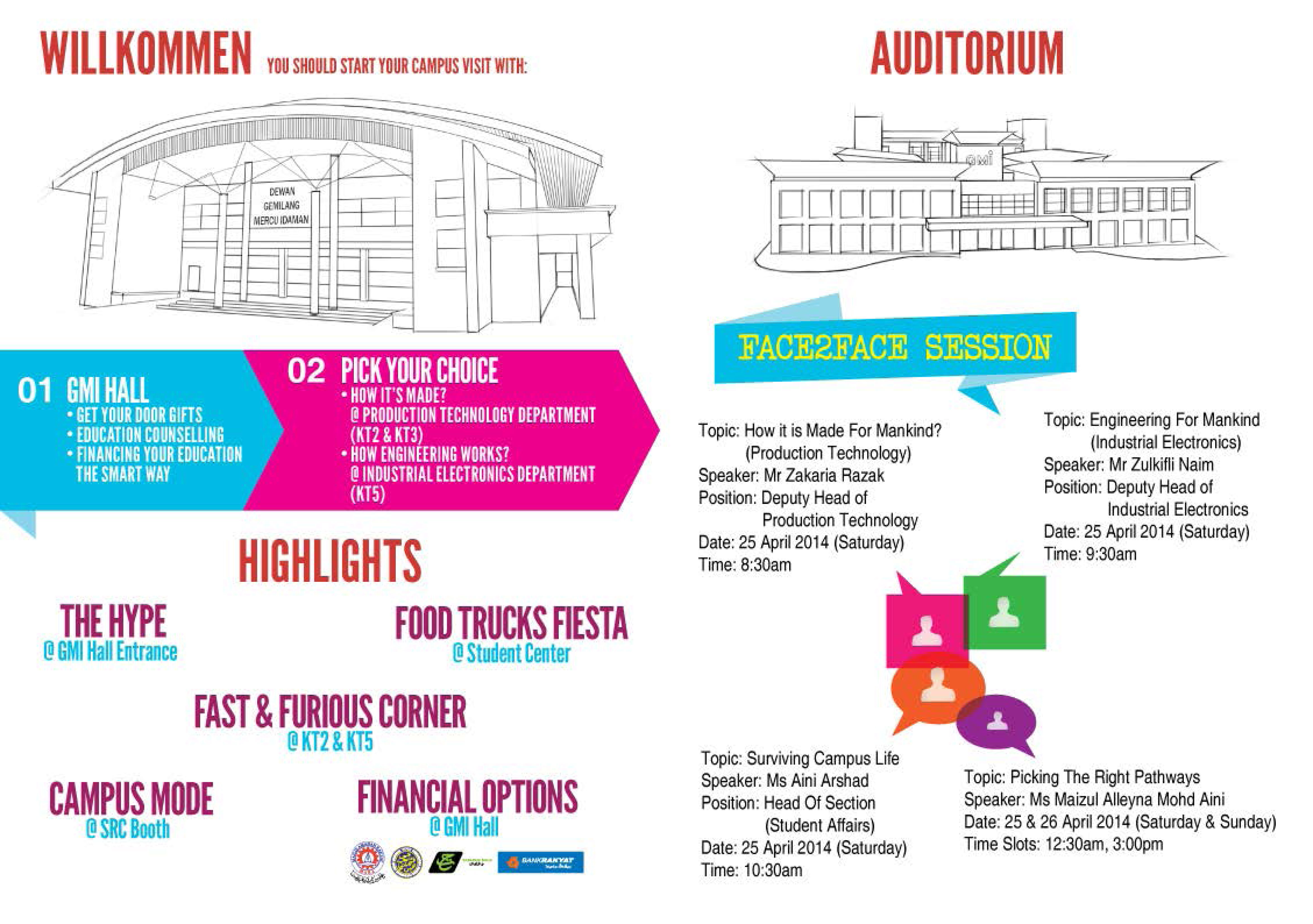 GMI Open Day is one of the significant events in the calendar and is publicized nationwide during roadshows. The programme for the day includes discussions with programme consultants, a guided campus walkabout or tour around the training facilities and Final year Project galleries, group briefings, getting-to-know the alumni session, and of course, the study application.